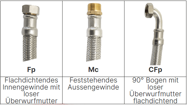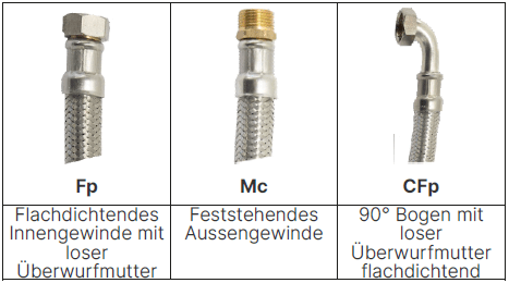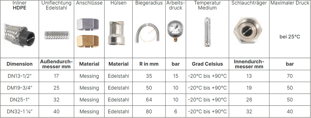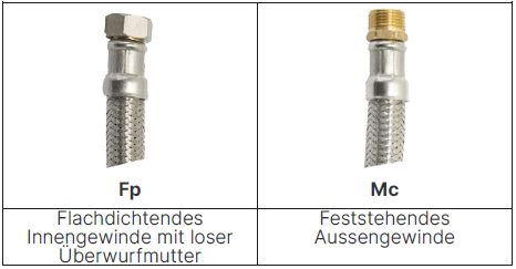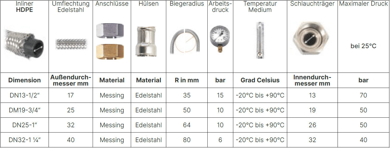 Hinweis: Bei zu erwartender Korrosionsgefahr z. b. durch Schwitzwasserbildung ist der Schlauch mit nicht rostender Edelstahldrahtumflechtung zu bestellen. Dies gilt auch dann, wenn der Schlauch isoliert wird.